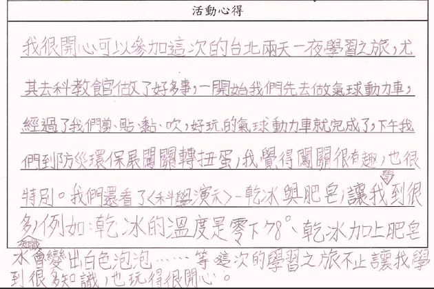 參觀科學教育館過後,孩子們能對「科學」有了更活潑的體驗,他們發現原來身邊一些不起眼的日用品(例如氣球、迴紋針、弓弦等),都暗藏著許多功能,背後都有其物理或化學原理,這些都有助於培養孩子解決問題的能力。